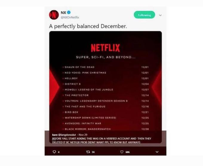 O perfil de novidades da Netflix divulgou uma imagem com os lançamentos de ficção científica deste mês, e deixou vazar que o quinto ano de Black Mirror estreia em 28 de dezembro. A imagem foi apagada logo em seguida, mas deu tempo dos fãs printarem e espalharem na web.