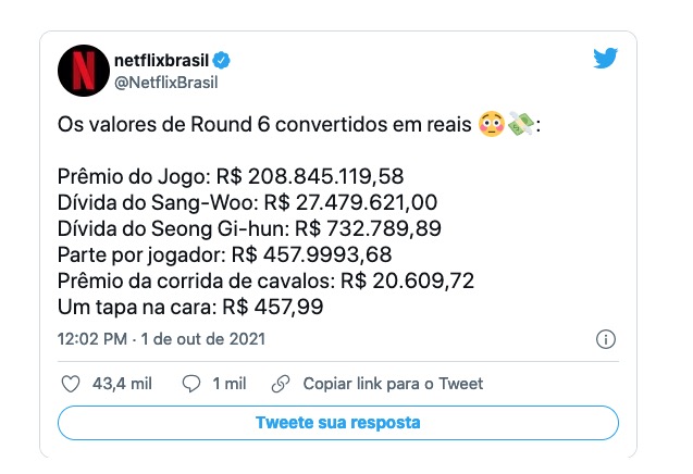 Com o sucesso da série no Brasil, o streaming fez a conversão da moeda sul-coreana, Won, para o real, e os valores do prêmio e das dívidas dos protagonistas. Agora dá pra saber inclusive quanto o participante ganha por aceitar um tapa na cara.