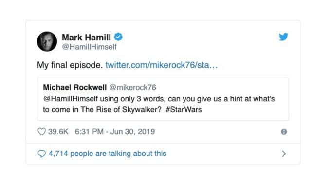 "Usando apenas 3 palavras, você pode nos dar uma dica do que virá em A Ascensão Skywalker?", mandou um usuário da rede social. Hamill, então, respondeu: "meu episódio final”.