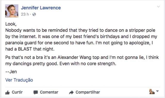 "Olha, ninguém quer ser lembrado que tentou dançar em um poledance de stripper na internet. Era o aniversário de uma das minhas melhores amigas e eu baixei minha guarda paranoica por um segundo para me divertir. Eu não vou me desculpar, eu me diverti muito naquela noite"