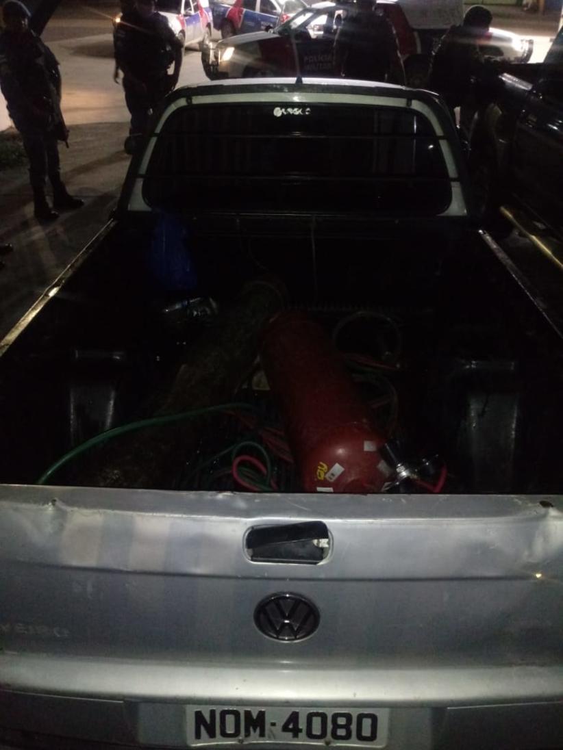 Frustrados, eles fugiram deixando para trás um carro modelo saveiro prata, de placa NOM 4080, um cilindro de oxigênio e outro de acetileno, além de um pé de cabra, uma marreta, 1 chave de fenda, uma chave americana, 1 alicate, luvas de solda e até um maçarico.
