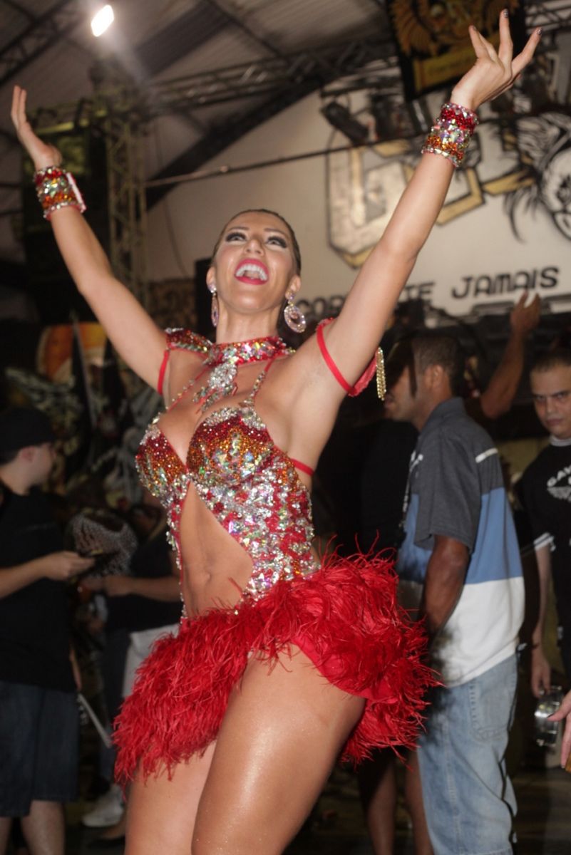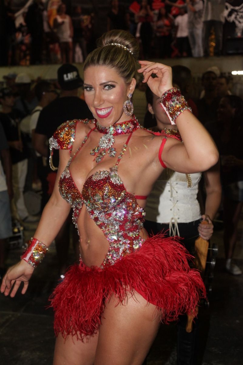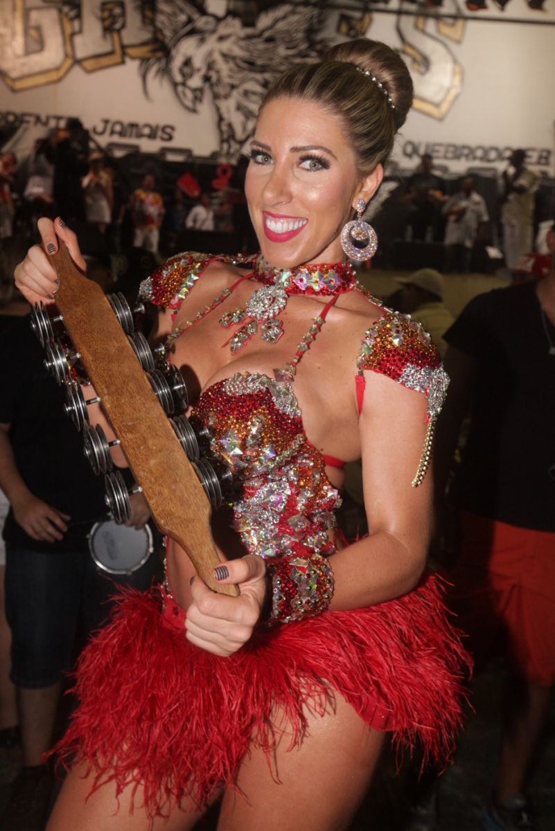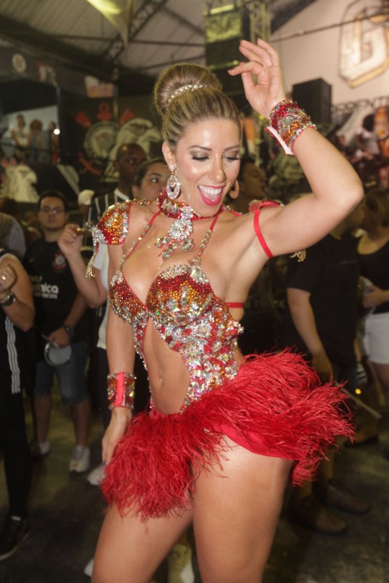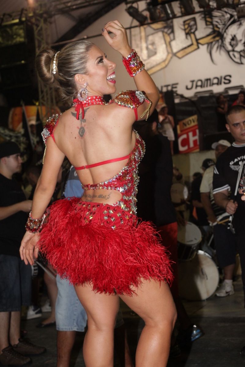 Tati Minerato ousou na escolha do look para o ensaio da Gaviões da Fiel na madrugada do domingo, 19. Isso porque, além de ultra sexy, a fantasia a Rainha utilizou um look vermelho para dar uma variada nas cores da escola que é Alvi Negra,no ensaio desta madrugada. Ana Paula Minerato, sua irmã e musa da agremiação esteve ausente no ensaio.