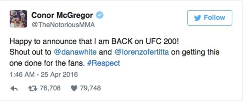 O futuro de Conor McGregor no UFC já foi definido. Após ser descartado pela organização, o lutador usou sua conta no Twitter para avisar que está no card do UFC 200.