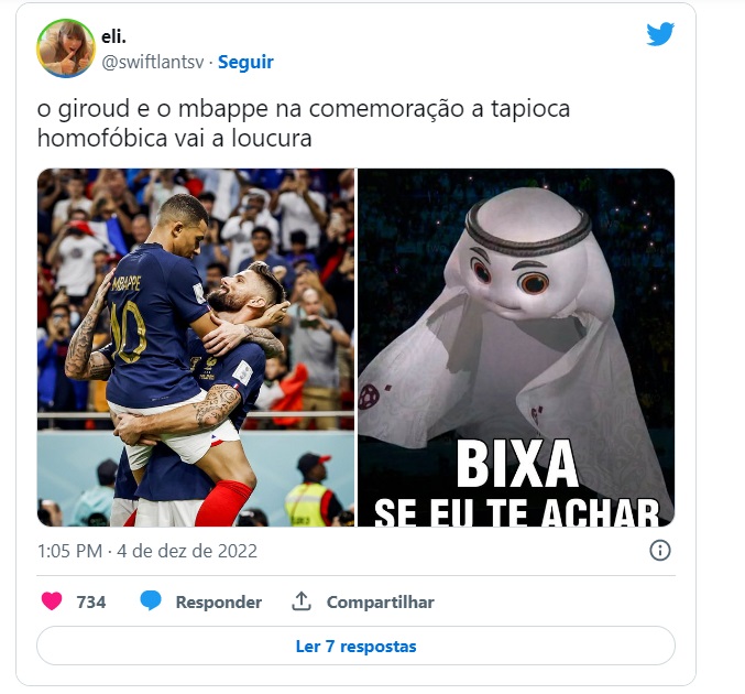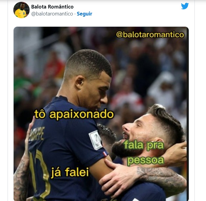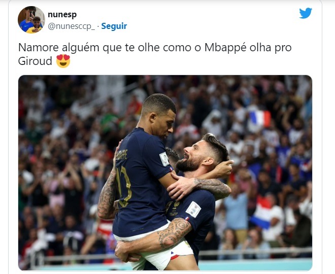 Os atacantes se abraçaram durante a comemoração do primeiro gol da França na partida, marcado por Giroud após assistência de Mbappé. O centroavante levantou o camisa 10 e eles trocaram olhares, rendendo fotos que fizeram alguns internautas enxergarem um "clima romântico". Os memes tomaram conta das redes sociais.