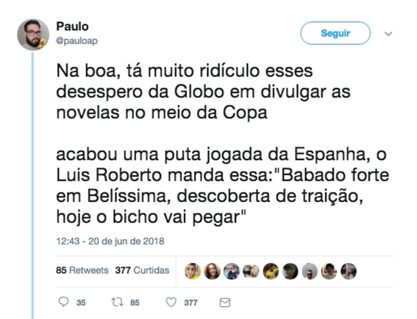 "A Globo tentando dar uma turbinada na audiência das novelas usando a Copa do Mundo e acabando virando piada. Os caras nem assistem novela e fazendo chamada, todos desengonçados".