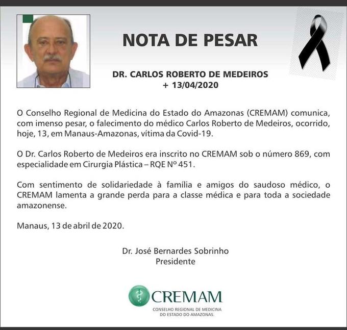 Manaus/AM - O cirurgião plástico Carlos Roberto de Medeiros faleceu nesta segunda-feira (3), vítima do novo coronavírus (Covid-19). A morte foi confirmada pelo Conselho Regional de Medicina do Estado do Amazonas (Creman).