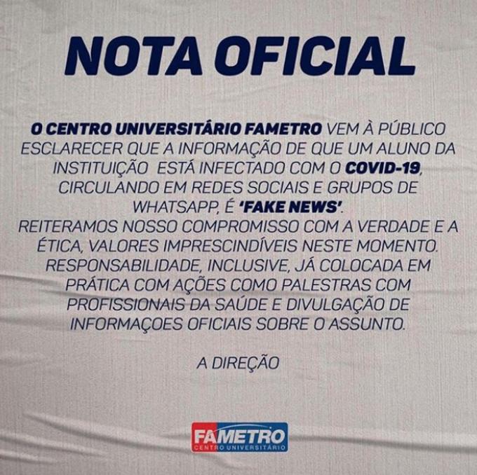 Através de uma nota divulgada nas redes sociais, a instituição afirma que se trata de uma notícia falsa. "O Centro Universitário Fametro vem a público esclarecer que a informação de que um aluno da instituição está infectado com o Covid-19, circulando em redes sociais e grupos de whatsapp. É 'fake news'.", informou. Confira a íntegra do comunicado: