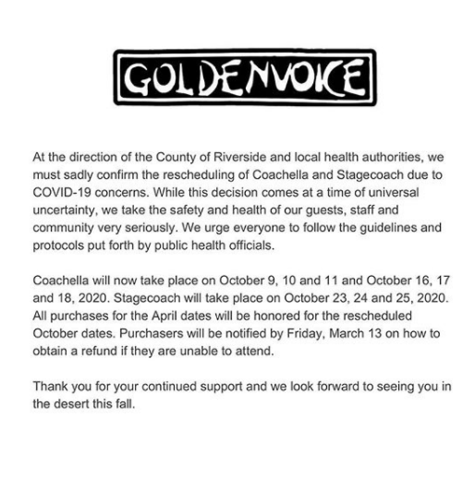 "Sob a direção do Condado de Riverside e de autoridades locais de saúde, nós tristemente precisamos confirmar o adiamento do Coachella e do Stagecoach devido a preocupações com o Covid-19. Embora esta decisão venha em um momento de incerteza universal, nós levamos muito a sério a segurança e a saúde de nossos visitantes, estafe e comunidade. Nós pedimos que todos sigam os procedimentos e protocolos determinados pelos oficiais de saúde pública. O Coachella agora ocorrerá em 9, 10, 11, 16, 17 e 18 de outubro de 2020. O Stagecoach ocorrerá nos dias 23, 24 e 25 de outubro. Todos os ingressos comprados para as datas de abril serão considerados para as novas datas de outubro. Os compradores serão notificados até esta sexta-feira, 13 de março, sobre como obter reembolso se não puderem comparecer. Agradecemos pelo apoio contínuo e aguardamos para vê-los em outubro", conclui o comunicado da Goldenvoice, a companhia que organiza o evento.