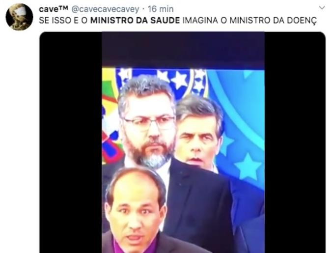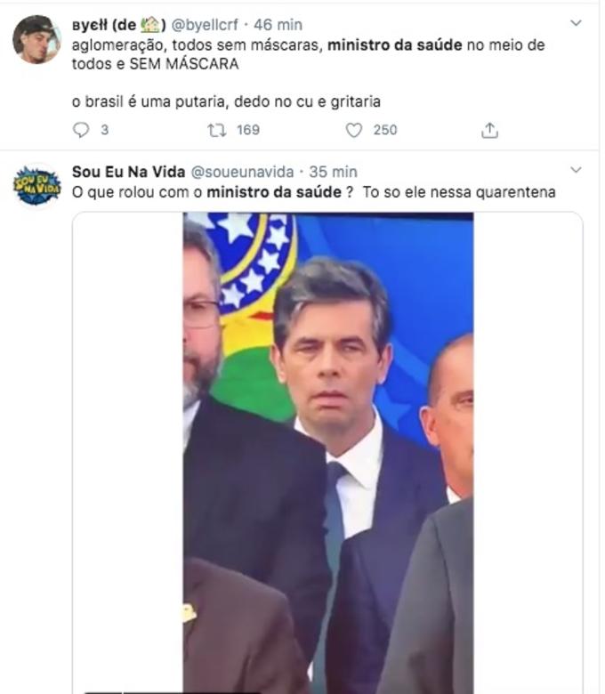 No Twitter, a tag Ministro da Saúde ficou entre os assuntos mais comentados da rede social durante o discurso, com internautas questionando se ele estaria bem de saúde, prestes a desmaiar, e outros afirmando que ele estaria entediado. Outro detalhe que chamou atenção foi que, em plena pandemia de coronavírus, o presidente da República e seus ministros, incluindo Teich, estavam aglomerados lado a lado e sem máscaras, sem respeitar as regras básicas recomendadas pela OMS para prevenir a Covid-19. Confira alguns dos comentários: