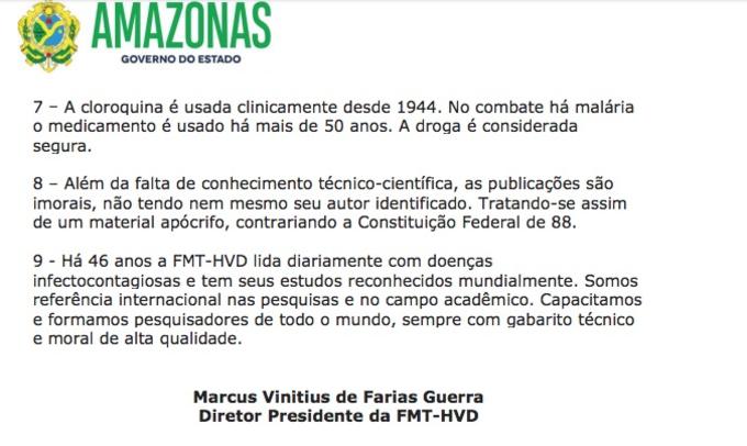 Manaus/AM - A Fundação de Medicina Tropical do Amazonas (FMT-HVD) emitiu uma nota de repúdio nesta quinta-feira (16) contra publicações feitas em páginas da internet sobre o estudo CloroCovid-19. Segundo o Diretor Presidente da FMT-HVD, Marcus Vinitius de Farias Guerra, os posts são preconceituosos e claramente desprovidos de conhecimentos da metodologia científica. Leia a íntegra da nota: