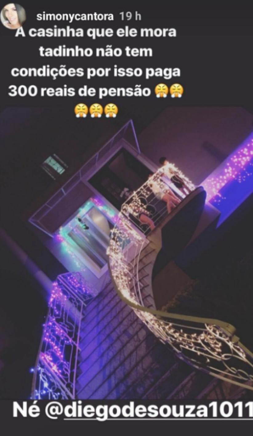 A cantora publicou uma foto da mansão do atual técnico do Taboão da Serra, ironizando: "A casinha que ele mora, tadinho, não tem condições. Por isso paga R$ 300 de pensão. Né, Diego Souza?", escreveu, marcando o ex na mensagem.