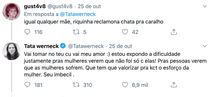 Mas foi criticada por um seguidor: "Igual qualquer mãe. Riquinha, reclamona, chata pra car****". A humorista não deixou barato e detonou o homem: "Vai tomar no teu ** vai meu amor. Estou expondo a dificuldade justamente pras mulheres verem que não foi só com elas! Pras pessoas verem que as mulheres sofrem. Que tem que valorizar pra cacete o esforço da mulher. Seu imbecil”., concluiu.