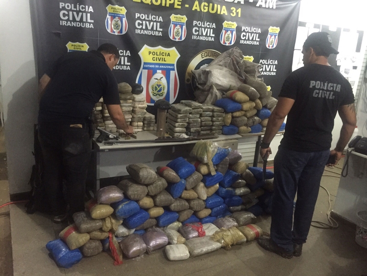 Iranduba/AM - Um grupo de quatro homens foi detido em flagrante em posse de 180 quilos de entorpecentes no Ramal do Janauari, comunidade homônima, zona Rural de Iranduba, distante 27 quilômetros Manaus. Eles foram identificados como Hélio Salgado Machado, 36, José Nilson Ribeiro Tuffic, 32, o "Pelado", Heber de Souza Lima, 49, e Vladimir Batista Coelho, 18. Policiais civis da 31ª Delegacia Interativa de Polícia (DIP), comandados pelo titular Paulo Mavignier, chegaram até a quadrilha após denúncias anônimas e passaram a investigar o bando.