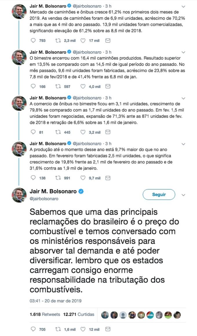 O comentário foi postado no Twitter pelo presidente após uma série de postagens sobre a venda de caminhões e ônibus nos primeiros meses de 2019.