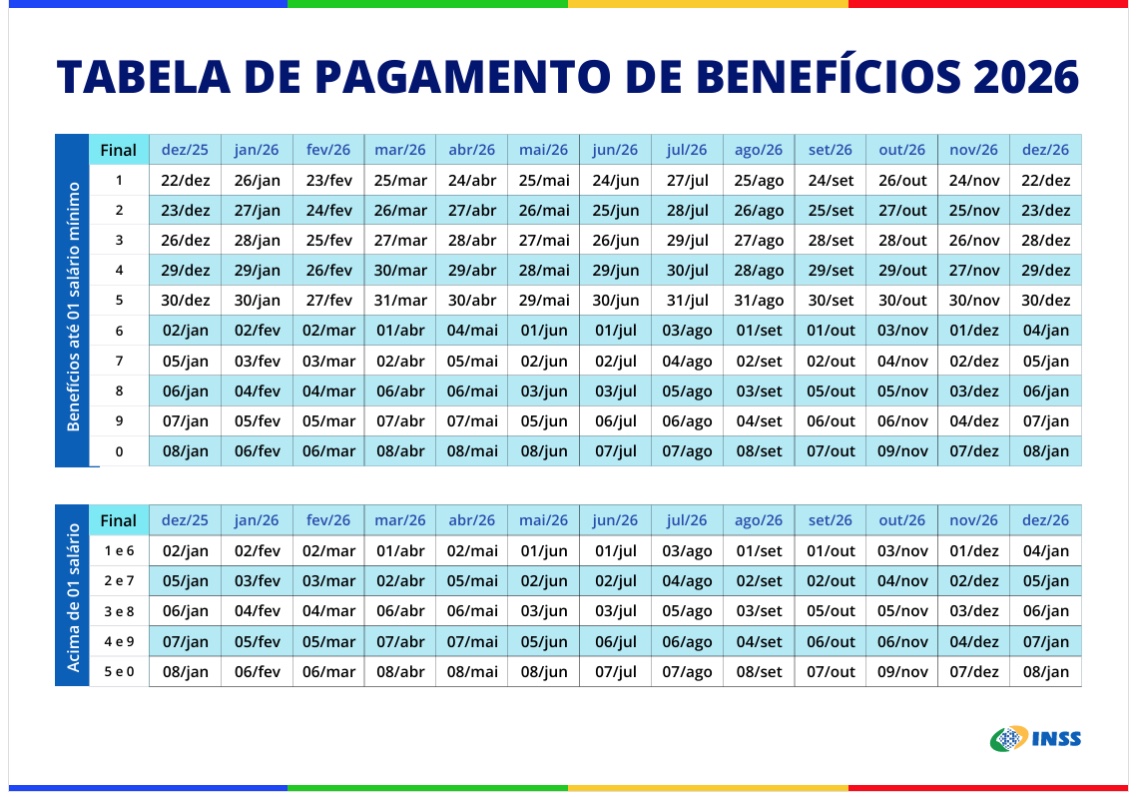 Para os segurados que recebem o salário mínimo, os pagamentos do primeiro mês do ano começam em 26 de janeiro. Já para quem recebe acima do piso nacional, os depósitos de janeiro serão creditados a partir de 2 de fevereiro.