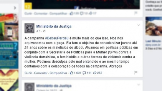 O Ministério da Justiça foi obrigado a tirar da sua página no Facebook um peça da campanha "Bebeu, Perdeu", que mira o abuso do álcool por adolescentes, depois da reação furiosa dos internautas. O post mostra duas adolescentes rindo de uma terceira, que aparece triste enquanto olha o celular, enquanto o texto diz: "Bebeu demais e esqueceu o que fez? Seus amigos vão te lembrar por muito tempo". A ideia de passar mensagens bem-humoradas para que os jovens não bebam foi vista pelos internautas como machista e indutora de bullying e assédio sexual. Em poucas horas, já havia recebido centenas de críticas, até que o ministério decidiu tirá-la do ar, substituindo por uma explicação.