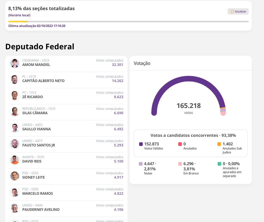 Manaus/AM - Confira o resultado parcial das eleições para Deputado Federal no Amazonas, com 8,13% das urnas apuradas: