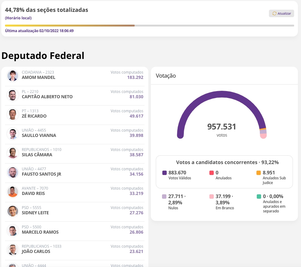 Manaus/AM - Confira o resultado parcial das eleições para Deputado Estadual e Deputado Federal no Amazonas, com mais de 40% das urnas apuradas: