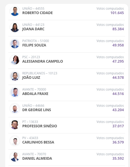 Manaus/AM - Confira abaixo a lista dos 24 deputados estaduais eleitos para os próximos quatro anos no Amazonas. Na lista, Roberto Cidade (União) e Joana Darc (União) foram reeleitos como os mais votados neste domingo (2).