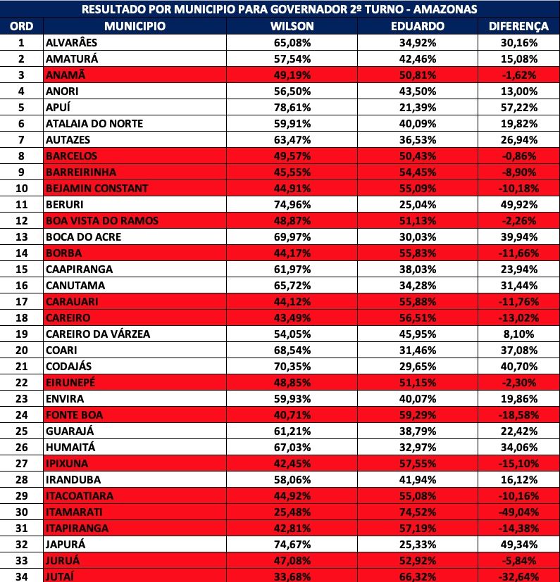 O município que Wilson Lima teve a maior vitória foi em Apuí, onde alcançou 78,61% dos votos, contra 21,39% para Braga, uma diferença de 57,22%. Braga teve sua maior vitória em Itamarati, tendo recebido 74,52% dos votos, contra 25,48% de Wilson, uma diferença de 49,04%.