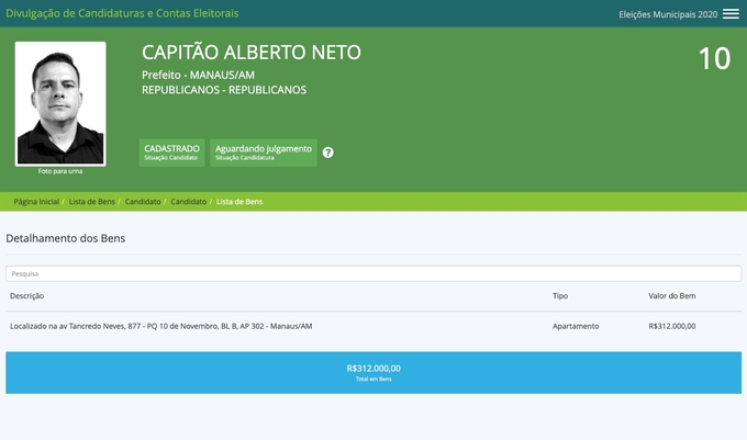 Manaus/AM - O deputado federal Alberto Neto (Republicanos), candidato à Prefeitura de Manaus nas eleições deste ano, apresentou sua declaração de bens para a Justiça Eleitoral, onde afirma possuir apenas um apartamento avaliado em R$ 312 mil. Os dados sobre o candidato podem ser consultados no site DivulgaCand do Tribunal Superior Eleitoral (TSE).