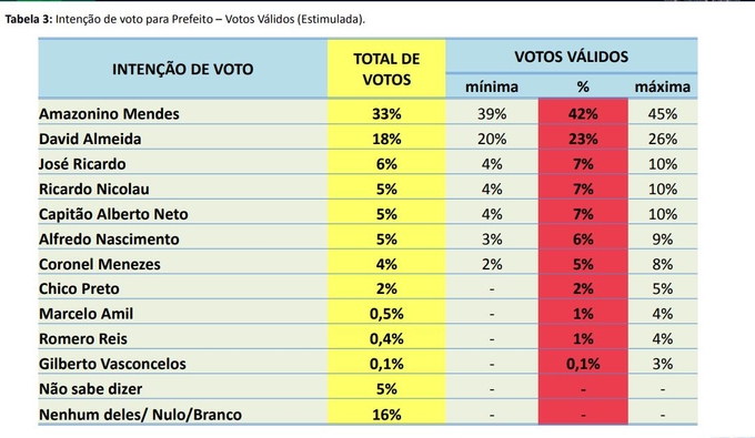 Manaus/AM - Pesquisa realizada no período de 22 a 25 de setembro, pela DMP/Rede Tiradentes e registrada sob nº 01820/2020, com um universo de 1003 entrevistados, dá a preferência ao candidato Amazonino Mendes (Podemos), com 33% da preferência dos consultados.