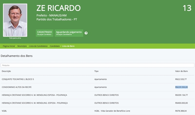 Manaus/AM - O plano de governo de José Ricardo (PT) como candidato à Prefeitura de Manaus foi apresentado à Justiça Eleitoral, assim como sua declaração de bens com valor total superior a R$ 1,4 milhão. Os dados estão disponíveis para consulta no site DivulgaCand do Tribunal Superior Eleitoral (TSE) e serão analisados para formalizar o registro da candidatura de José Ricardo e de sua vice, Marklize Siqueira (Psol).