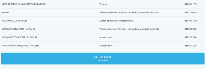 José Ricardo tem como maiores valores declarados em sua lista de bens duas heranças de sua esposa, Cristiane Socorro Wendling, sendo de dois valores, um de R$ 400 mil e o outro de R$ 339.134,77. O terceiro maior valor divulgado é de uma apartamento avaliado em R$ 229.550,00. Na declaração de Marklize, foi registrado apenas um carro no valor de R$ 27,9 mil.
