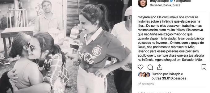 "Ela costumava nos contar as histórias sobre a infância que ela passou na Ilha... De como eles passavam trabalho, mas mesmo assim eram muito felizes! Ela contava que não tinha realização maior do que quando alguém ia lá ajudar, levar cesta básica ou sopas no inverno... Ontem, com a graça de Deus, nós podemos te representar Mãe, levando para essas pessoas que precisam, aquilo que tu sempre disse que era tua alegria na infância. Agora cheguei em Salvador Mãe, na Bahia! Onde tu sempre sonhou conhecer, vou caminhar pela praia, ver os artesanatos que tu amava... Neste mesmo dia 28 de dezembro tu estava indo conhecer papai do céu, indo pra um lugar bem melhor que o nosso! Eu te amo além da vida Mãe. E vou viver a minha vida, por ti e para ti."