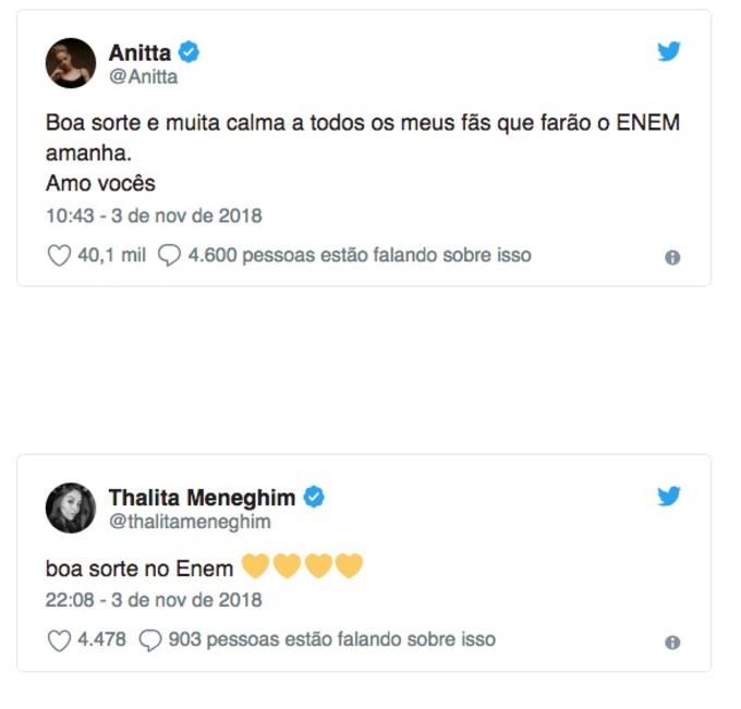 RIO — Artistas e famosos têm usado as redes sociais para enviar de mensagens de boa sorte e incentivo a lembretes para que os candidatos que prestam Enem neste domingo não percam o horário da prova. Além de boa sorte, as cantoras Anitta e Marília Mendonça desejaram calma e paciência para os inscritos. A atriz Sophia Abrahão disse para seus seguidores confiarem na inteligência e capacidade e o humorista Tom Cavalcante brincou: "Pra você que só chega atrasado saia agora de casa e durma dentro da sala". Veja as publicações: