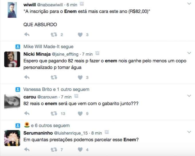 Quem não gostou nada do aumento do valor da inscrição foram os estudantes que usaram as redes sociais para se manifestar. A hashtag “Enem” é o assunto mais comentado do dia e gerou comentários engraçados a respeito.