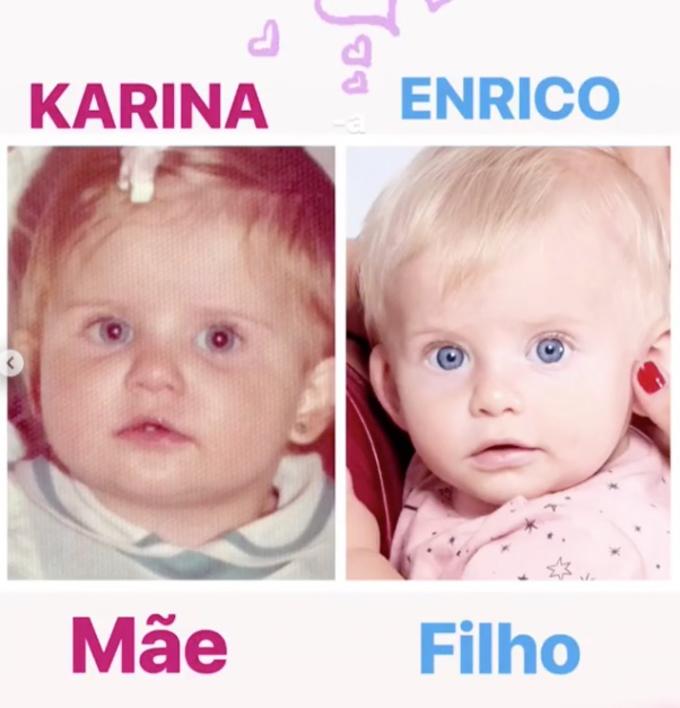 Karina Bacchi revirou o baú e publicou uma foto antiga de quando era bebê e comparou com o filho, Enrico, de 8 meses.