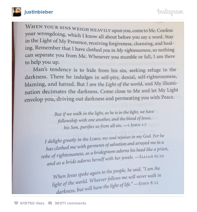Bieber publicou no Instagram uma foto com parte de uma página do livro 'Jesus Calling', da escritora presbiteriana Sarah Young. O trecho do manual fala de perdão e cita três versículos da Bíblia: