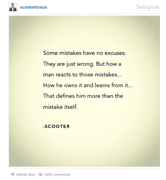 O empresário do artista, Scooter Braun, também se manifestou por meio da internet, publicando uma imagem com a mensagem: "Alguns erros não têm desculpa. São simplesmente errados. Mas a forma como um homem reage a esses erros... Como ele se responsabiliza por eles e aprende com eles... Isso o define mais do que seu próprio erro".