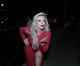 Com decotão e uma fenda generosa, a loira chegou chamando atenção em uma Lamborghini usando um vestido estilo vermelho fatal.