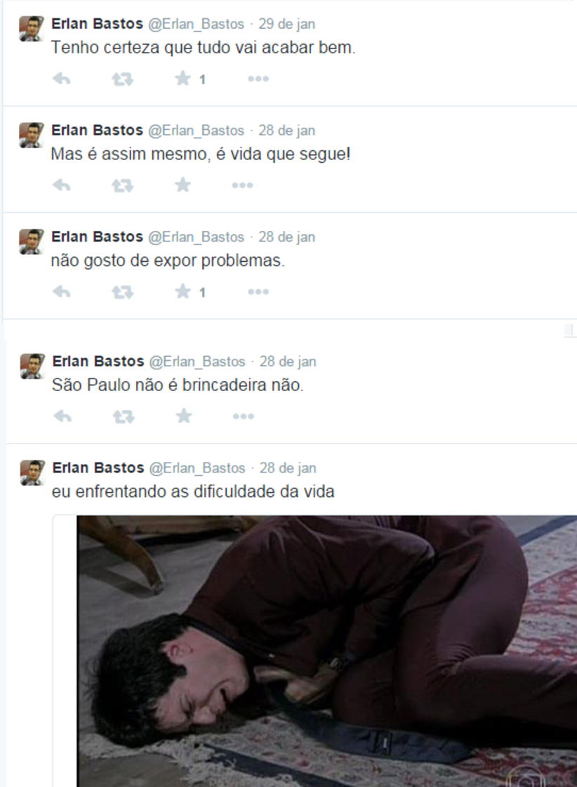 No Twiiter, Erlan não entra em detalhes, mas dar a entender que está passando por dificuldades em São Paulo.