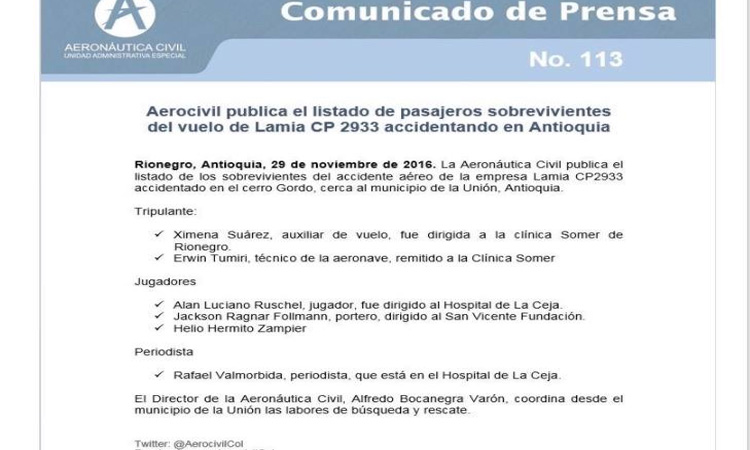 Confira a nota oficial divulgada pela Aeronáutica da Colômbia: