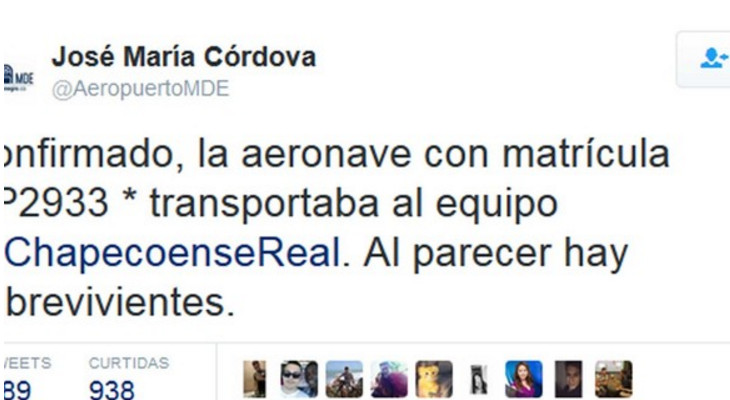 Conforme a publicação, o avião de matrícula CP2933 * transportava 72 pessoas. O time embarcou rumo a Colômbia para disputar a primeira partida da final da Copa Sul-Americana, contra o Atlético Nacional, na quarta-feira (30).