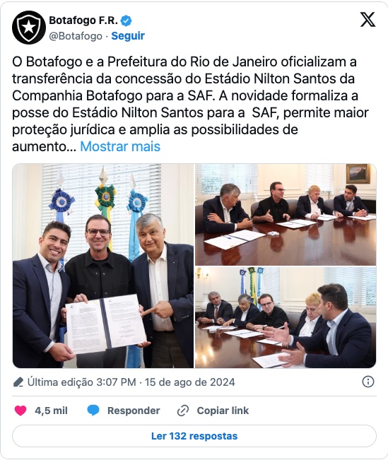 "O Botafogo e a Prefeitura do Rio de Janeiro oficializam a transferência da concessão do Estádio Nilton Santos da Companhia Botafogo para a SAF. A novidade formaliza a posse do Estádio Nilton Santos para a SAF, permitindo maior proteção jurídica e ampliando as possibilidades de aumento de receita no espaço. Agradecemos ao Prefeito Eduardo Paes pela liderança e condução do processo", declarou o clube.