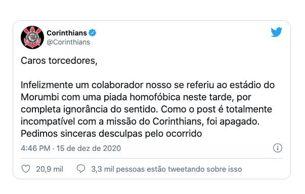 A mensagem foi apagada pelo clube, que fez um pedido de desculpas. "Caros torcedores. Infelizmente um colaborador nosso se referiu ao estádio do Morumbi com uma piada homofóbica nesta tarde, por completa ignorância do sentido. Como o post é totalmente incompatível com a missão do Corinthians, foi apagado. Pedimos sinceras desculpas pelo ocorrido", escreveu.