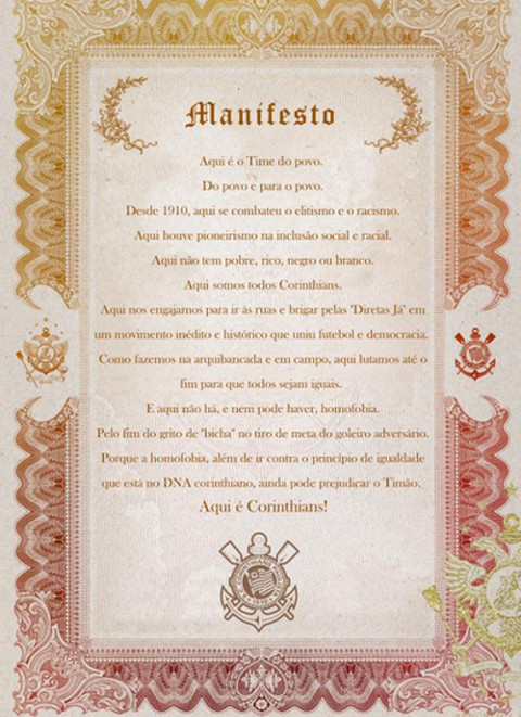 No texto, o Corinthians cita a história do clube , a fama de time do povo, recorre ao período da Democracia na década de 80 e afirma: "(...) a homofobia, além de ir contra o princípio de igualdade que está no DNA corinthiano, ainda pode prejudicar o Timão".