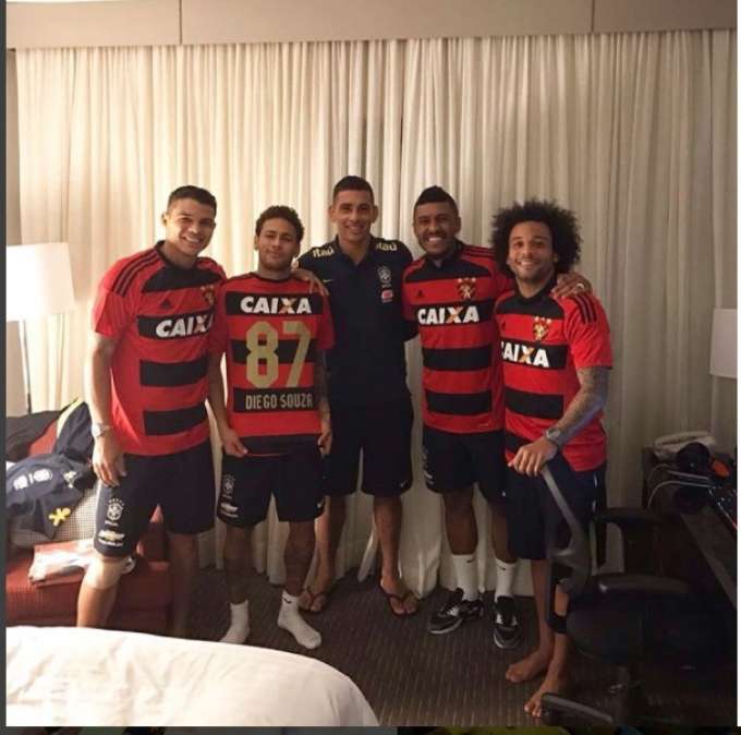 O meia -atacante do Sport, Diego Souza está comemorando muito sua convocação e a vitória da seleção brasileira em cima do Uruguai e Paraguai. E para mostrar que está totalmente em casa e sintonia com os demais colegas canarinhos, ele resolveu fazer um agrado ao rapazes e deu uma camisa de seu atual clube para os craques Neymar, Thiago Silva, Marcelo e Paulinho.