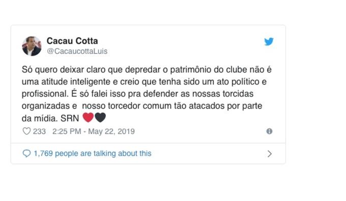 O diretor de relações externas do Flamengo, Cacau Cotta, deu uma declaração polêmica nesta quarta-feira (22) sobre as pichações nos muros da Gávea, durante participação no programa “Os Donos da Bola”, da Band. O dirigente deixou a entender que o ato teria motivações políticas, pois por estar escrito todo certinho, não teria sido realizado pela torcida rubro-negra.