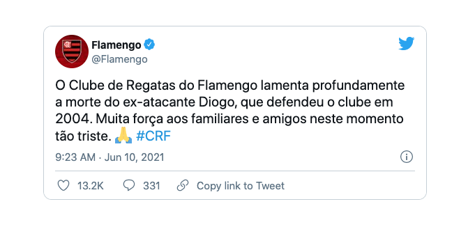 "O Clube de Regatas do Flamengo lamenta profundamente a morte do ex-atacante Diogo, que defendeu o clube em 2004. Muita força aos familiares e amigos neste momento tão triste".