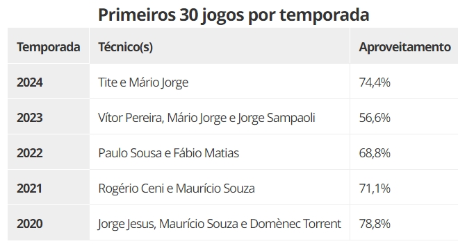 Para avaliar essa trajetória, foram comparados os primeiros 30 jogos oficiais de cada temporada, completados em 2024 com a marcante vitória por 6 a 1 sobre o Vasco no último domingo, no Maracanã.