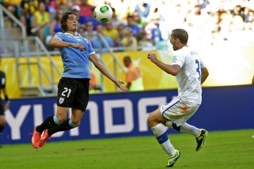 O atacante Cavani mata uma bola com Chielini na marcação em Salvador, 30 de junho, 2013