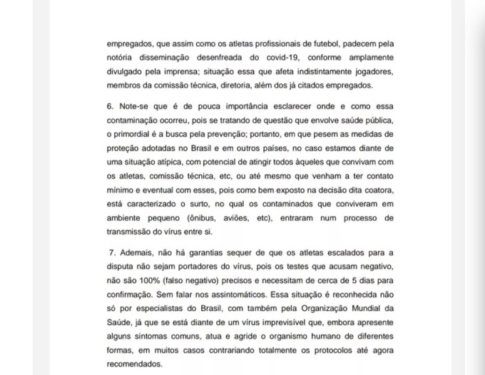 “Ademais, não há garantias sequer de que os atletas escalados para a disputa não sejam portadores do vírus, pois os testes que acusam negativo, não são 100% (falso negativo) precisos e necessitam de cerca de 5 dias para confirmação. Sem falar nos assintomáticos. Essa situação é reconhecida não só por especialistas do Brasil, com também pela Organização Mundial da Saúde, já que se está diante de um vírus imprevisível que, embora apresente alguns sintomas comuns, atua e agride o organismo humano de diferentes formas, em muitos casos contrariando totalmente os protocolos até agora recomendados”, aponta no documento.