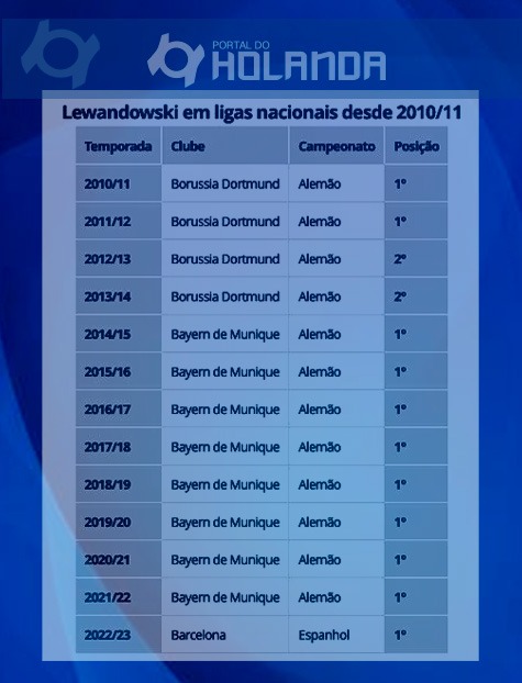 Com uma rotina vitoriosa, Robert Lewandowski mudou de clube no início da temporada 2022/23. Em seu primeiro ano no Barcelona, o jogador conquistou o título espanhol no último domingo e contabilizou sua 11º taça de liga nacional na carreira - um recorde contabilizando as cinco principais da Europa no século.