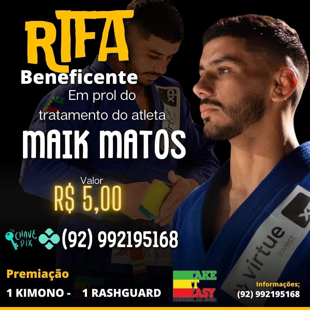 Rifa - Maik Matos também está vendendo uma Rifa Solidária, que custa R$ 5. Quem ajudar concorre a 1 kimono e 1 rashguard da marca Take It Easy. O valor pode ser depositado direto no PIX do atleta (92) 99219-5168, em nome de Felipe Maik de Oliveira Matos.