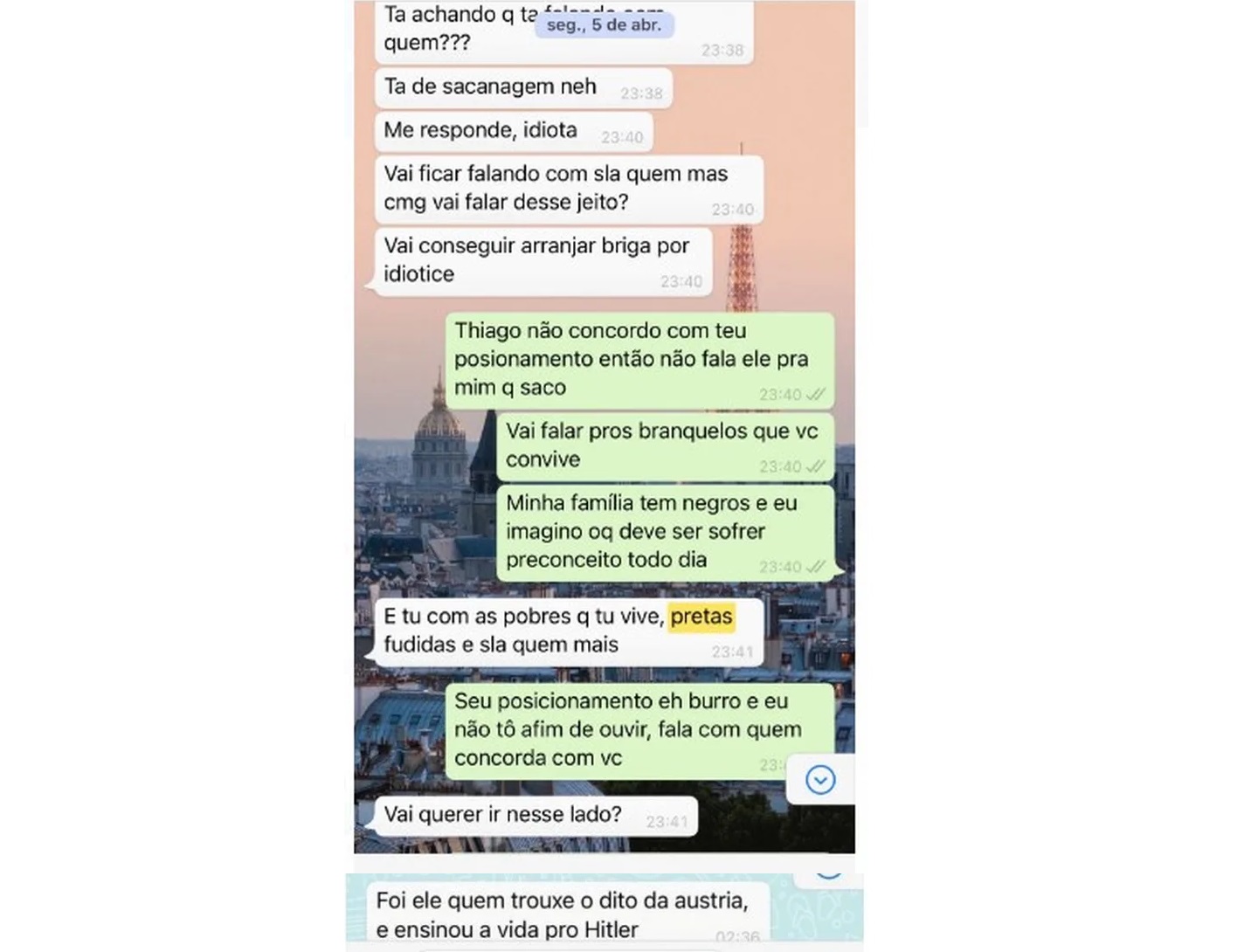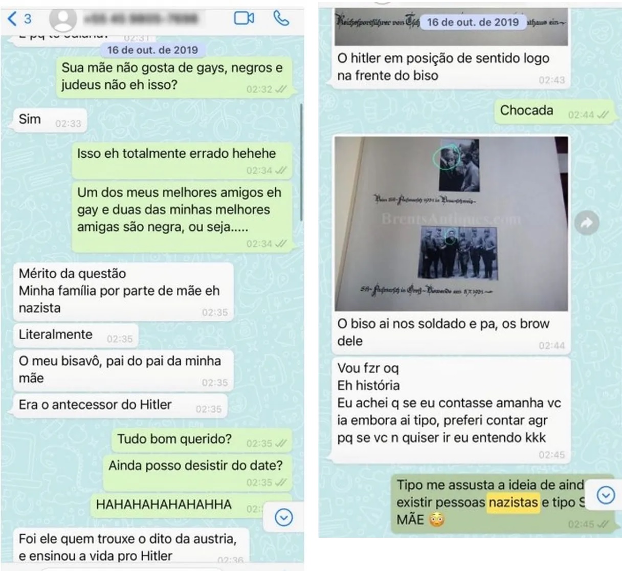 As conversas que citam o nazismo são do início do relacionamento, quando ambos ainda estão se conhecendo. Thiago fala sobre o histórico nazista de sua família por parte de mãe, afirmando que seu bisavô era “antecessor de Hitler” e que a mãe “não gosta de negros, gays e judeus”. Familiares de Thiago afirmaram que "repudiam veementemente esses comentários".